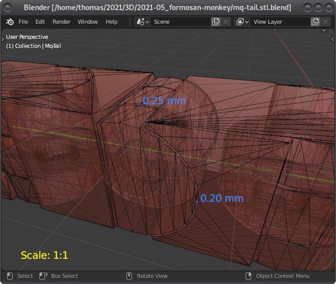 L’ objet qui me pose problème : la queue du singe. Elle peut être imprimée déjà assemblé, mais faut-il encore que mon imprimante soit capable de garder l’écart entre 2 parois intact.